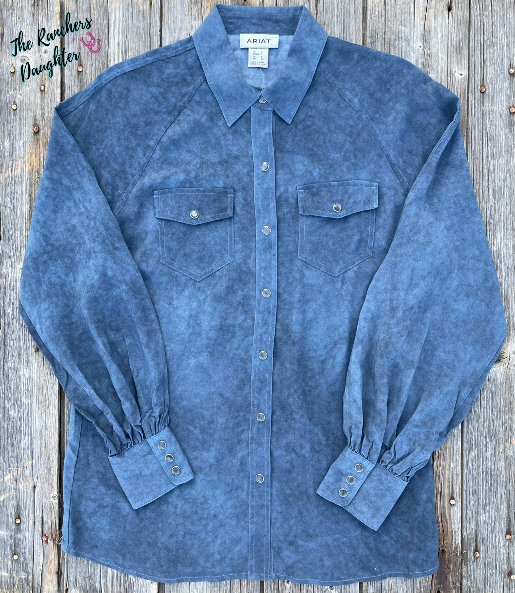 A cool, vintage-inspired fabric sets this classic shirt apart. Subtle variations in tone add depth, while bloused sleeves and onyx snaps give it a sophisticated, Western-chic look.