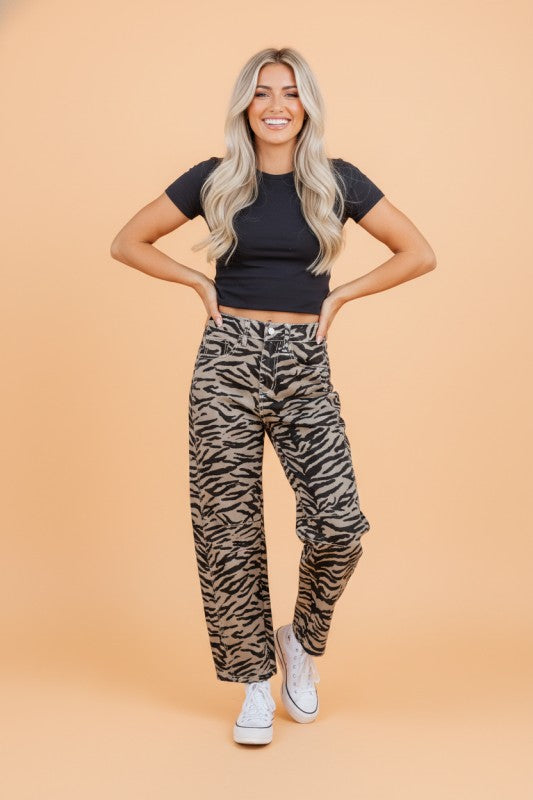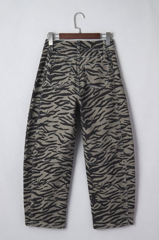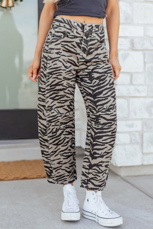 Make a statement with these Zebra Stripe Wide Leg Jeans, featuring a bold zebra print on soft, durable fabric that moves with you. The barrel leg silhouette tapers to a cropped ankle, while the mid-rise waist with button and zip closure provides a comfortable, flattering fit. Functional front and back pockets keep essentials within reach. Versatile enough to pair with knits, graphic tees, or flowy blouses, these jeans transition seamlessly from casual days to weekend outings. Polyester/Cotton/Spandex